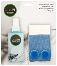 Dixon whiteboard cleaner kit.Contains one sponge eraser, 80ml whiteboard cleaner spray, two 30mm magnets and one micro fibre cloth measuring W190 x D170mm