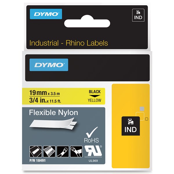 DYMO SD18491 RHINO INDUSTRIAL TAPE FLEXIBLE NYLON 19MM BLACK ON YELLOW