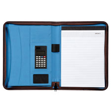 Features soft sudette finish, zip closure, A4 notepad with 120 pages 7mm ruled, three business card holders, two large loose page pockets on left hand side and I.D. display, elastic pen-loop, coloured lining and calculator