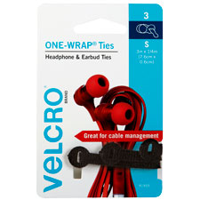 VELCRO BRAND ONE-WRAP HEADPHONE AND EARBUD TIES 6 X 76MM BLACK PACK 3